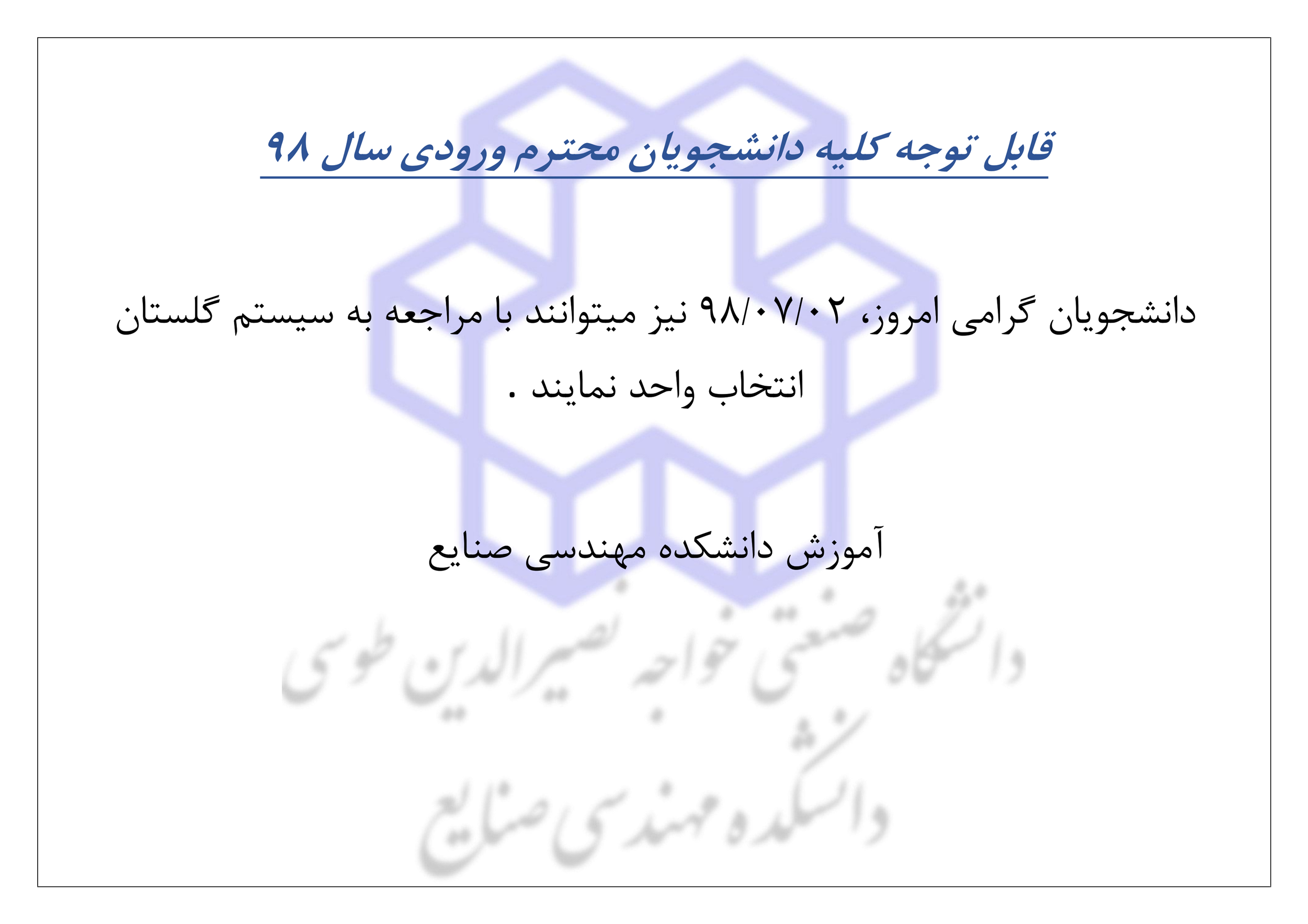 اطلاعيه انتخاب واحد - دانشجويان ورودي 98 - دانشکده مهندسی صنایع