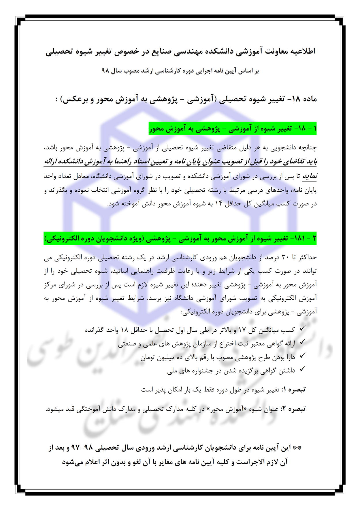 اطلاعيه بسيار مهم آموزشي در خصوص تغيير شيوه تحصيلي (آموزشي - پژوهشي به آموزش محور و برعكس)