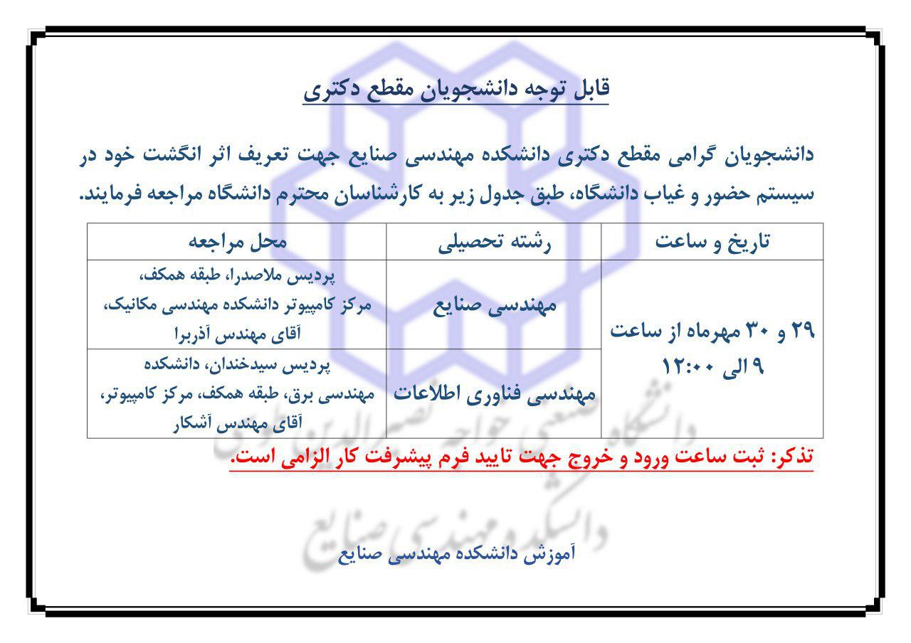 اطلاعيه ثبت ساعت ورود و خروج دانشجويان مقطع دكتري - دانشکده مهندسی صنایع
