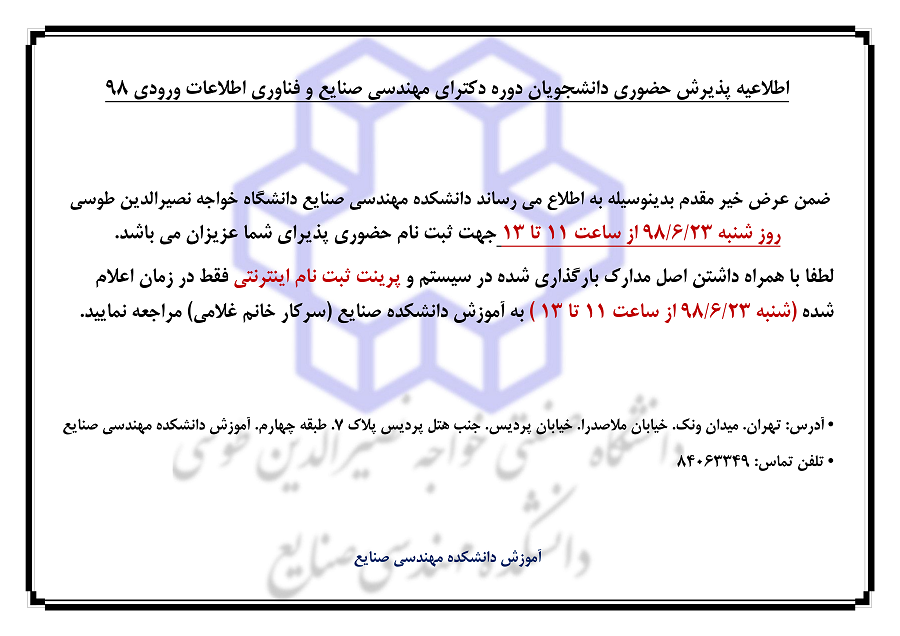 اطلاعيه پذيرش حضوري دانشجويان دوره دكتراي مهندسي صنايع و فناوري اطلاعات ورودي 98