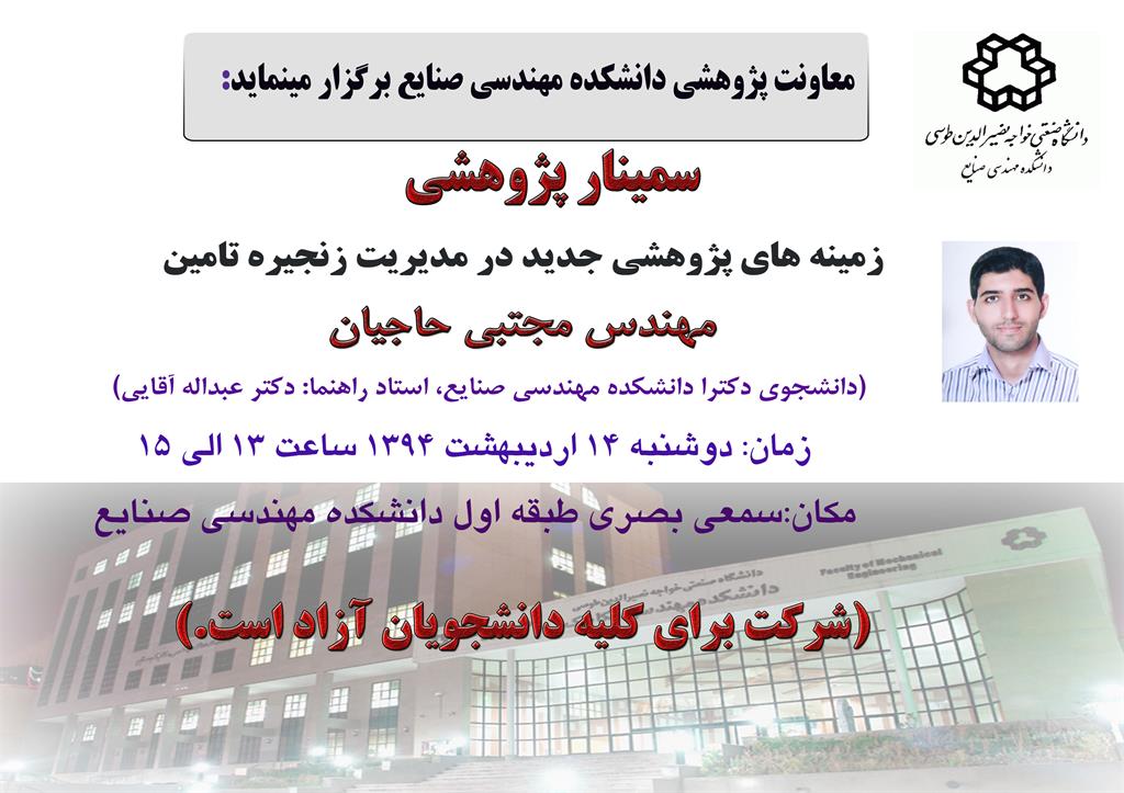 برگزاري سمينار پژوهشي با عنوان "زمينه هاي پژوهشي جديد در مديريت زنجيره تامين