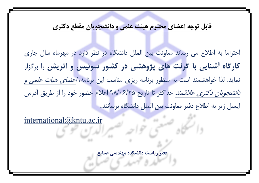 برگزاري كارگاه آشنايي با گرنت هاي پژوهشي در كشور سوئيس و اتريش براي اعضاي محترم هيئت علمي و دانشجويان مقطع دكتري
