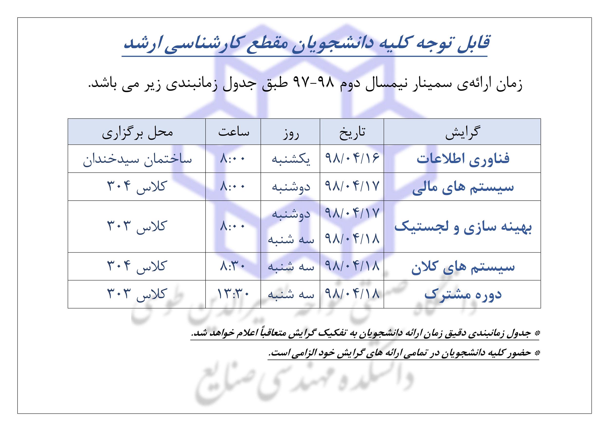 جدول زمانبندي ارائه سمينار هاي مقطع كارشناسي ارشد نيمسال دوم - دانشکده مهندسی صنایع