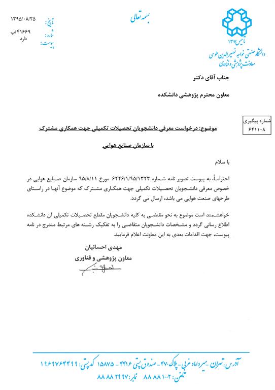 درخواست معرفي دانشجويان تحصيلات تكميلي جهت همكاري مشترك با سازمان صنايع هوايي