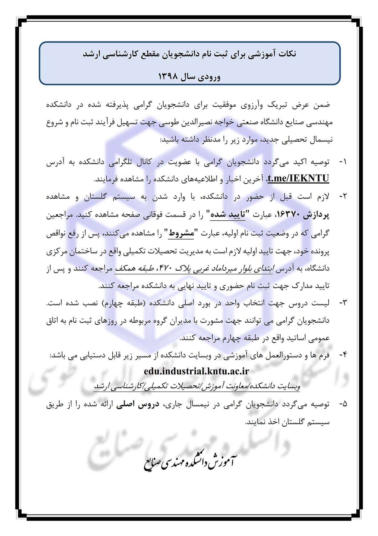نكات آموزشي براي ثبت نام دانشجويان مقطع كارشناسي ارشد ورودي سال 98 - دانشکده مهندسی صنایع