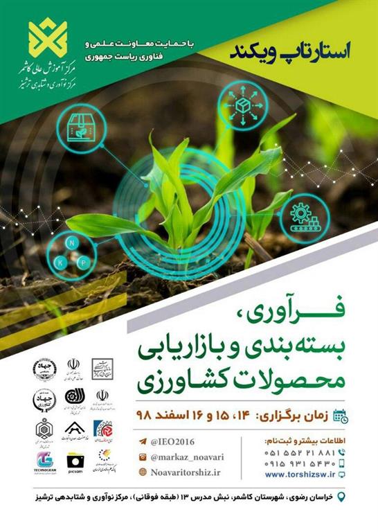 مرکز نوآوری و شتابدهی ترشیز با حمایت معاونت علمی و فناوری ریاست جمهوری اقدام به برگزاری استارتاپ ویکند فرآوری، بسته بندی و بازاریابی محصولات کشاورزی در اسفندماه سال جاری در شهرستان کاشمر نموده است.