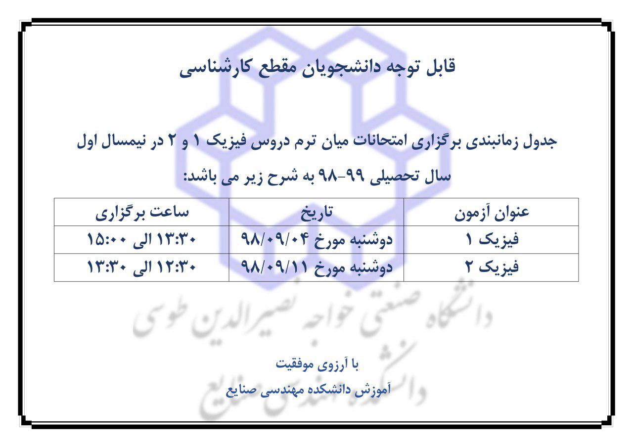 اطلاعيه برگزاري آزمون ميان ترم فيزيك 1 و 2 مقطع كارشناسي