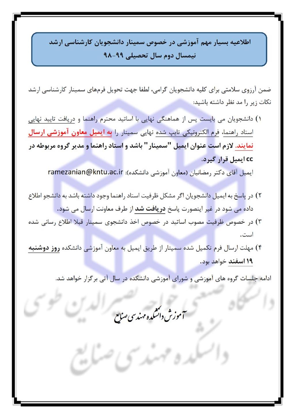 اطلاعیه شماره 3، اطلاعیه مهم آموزشی در خصوص سمینار مقطع کارشناسی ارشد