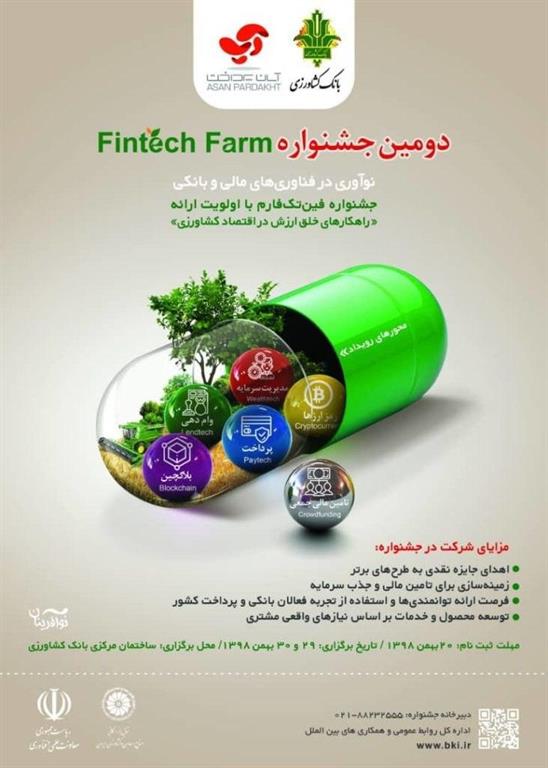بانک کشاورزی با مشارکت شرکت آسان پرداخت (آپ) دومین جشنواره کسب و کارهای فین‌تک با عنوان  FintechFarm را در روزهای 29 و 30 بهمن ماه فین‌تک برگزار می‌نماید.