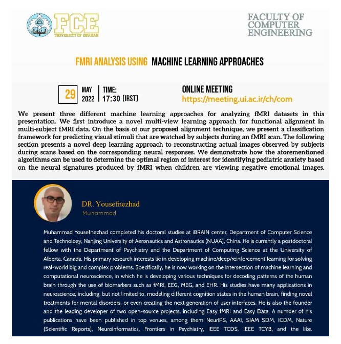 به اطلاع میرساند که سخنرانی علمی از سلسله سخنرانی های بین المللی دانشکده مهندسی کامپیوتر دانشگاه اصفهان با عنوان fMRI Analysis Using Machine Learning Approaches توسط آقای دکتر محمد یوسف نژاد محقق پسا دکتری در دانشگاه آلبرتا کانادا در روز یکشنبه 8 خرداد ماه 1401 ساعت 17:30 در اتاق مجازی به نشانی. https://meeting.ui.ac.ir/ch/com برگزار خواهد شد.