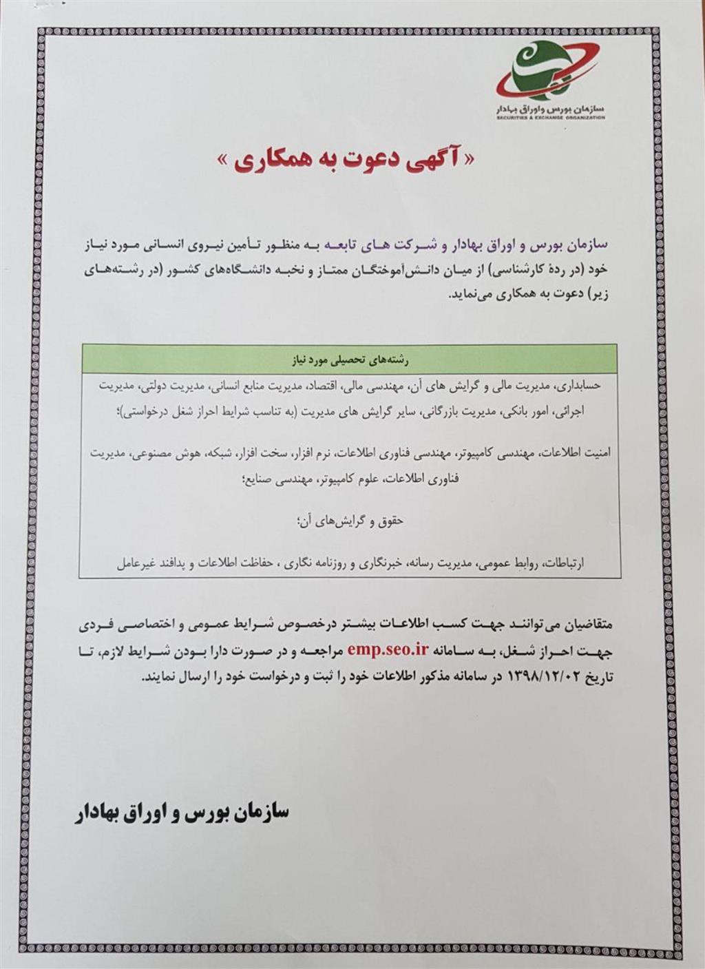 ✅ آگهی دعوت به همکاری در سازمان بورس و اوراق بهادار