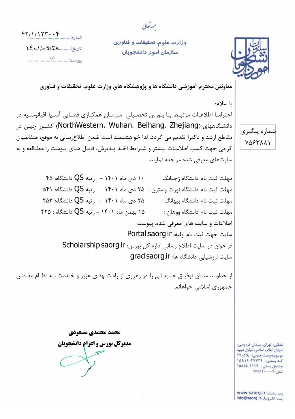 اعلام فراخوان بورس تحصیلی چین - اپسکو - دانشکده مهندسی صنایع