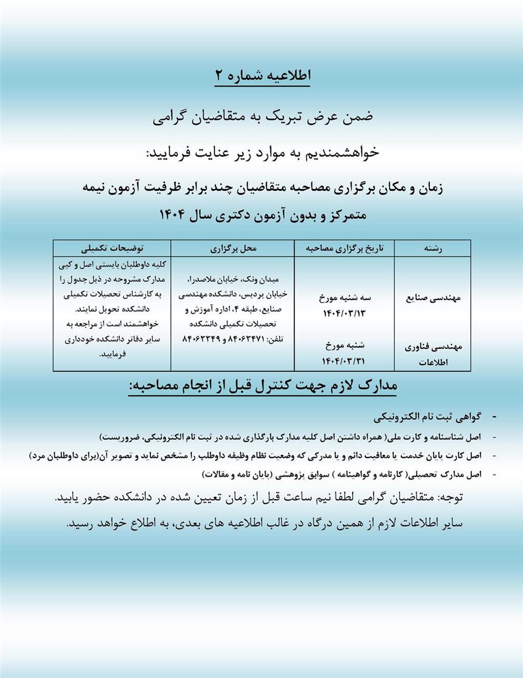 اطلاعیه شماره ۴ :تغییر تاریخ مصاحبه ی دکترا سال ۱۴۰۴ گرایش فناوری اطلاعات (با آزمون - استعداد درخشان) تکراری 2